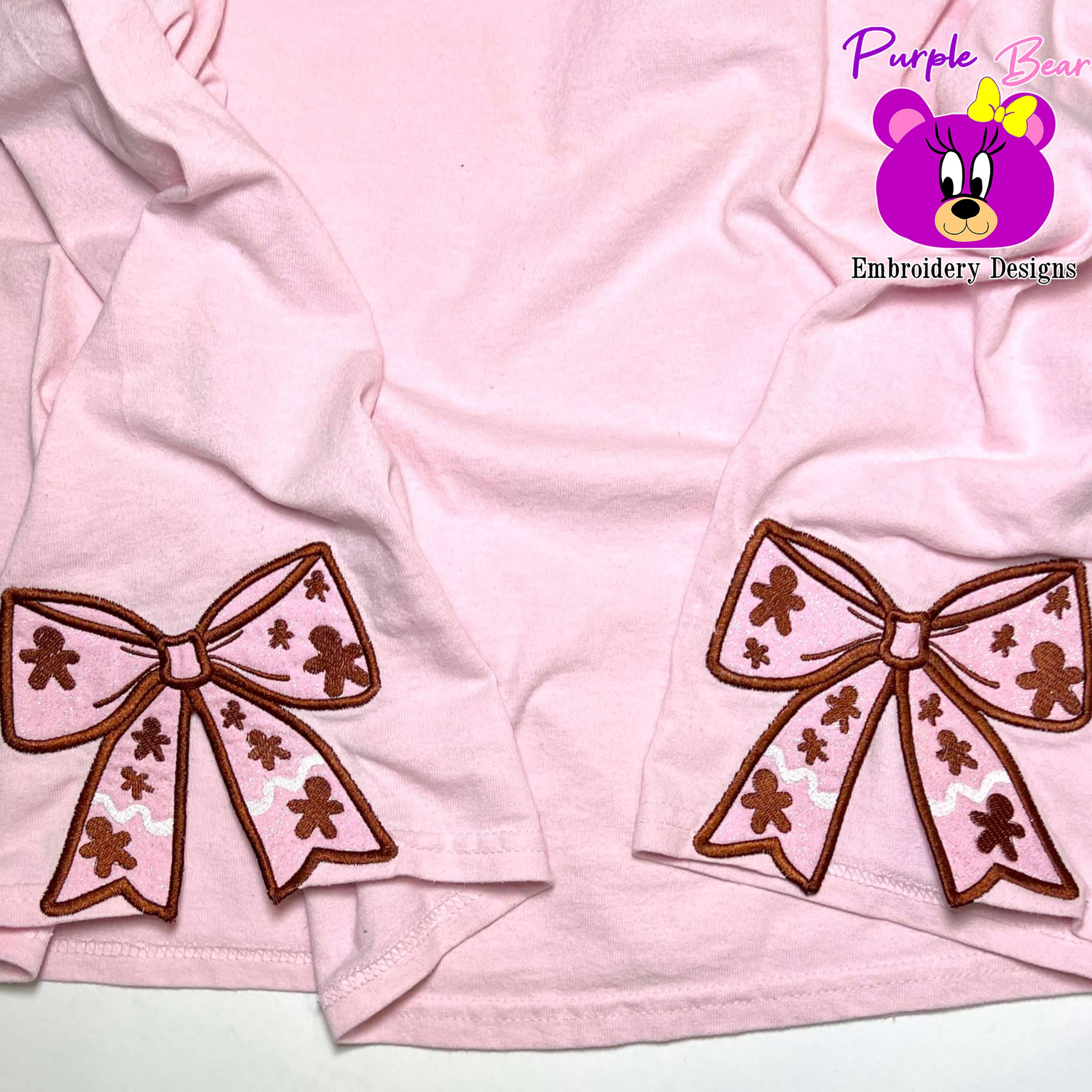 - Design Name – Gingerbread Side Bow Appliqué for Sweatshirt Garment 3 sizes